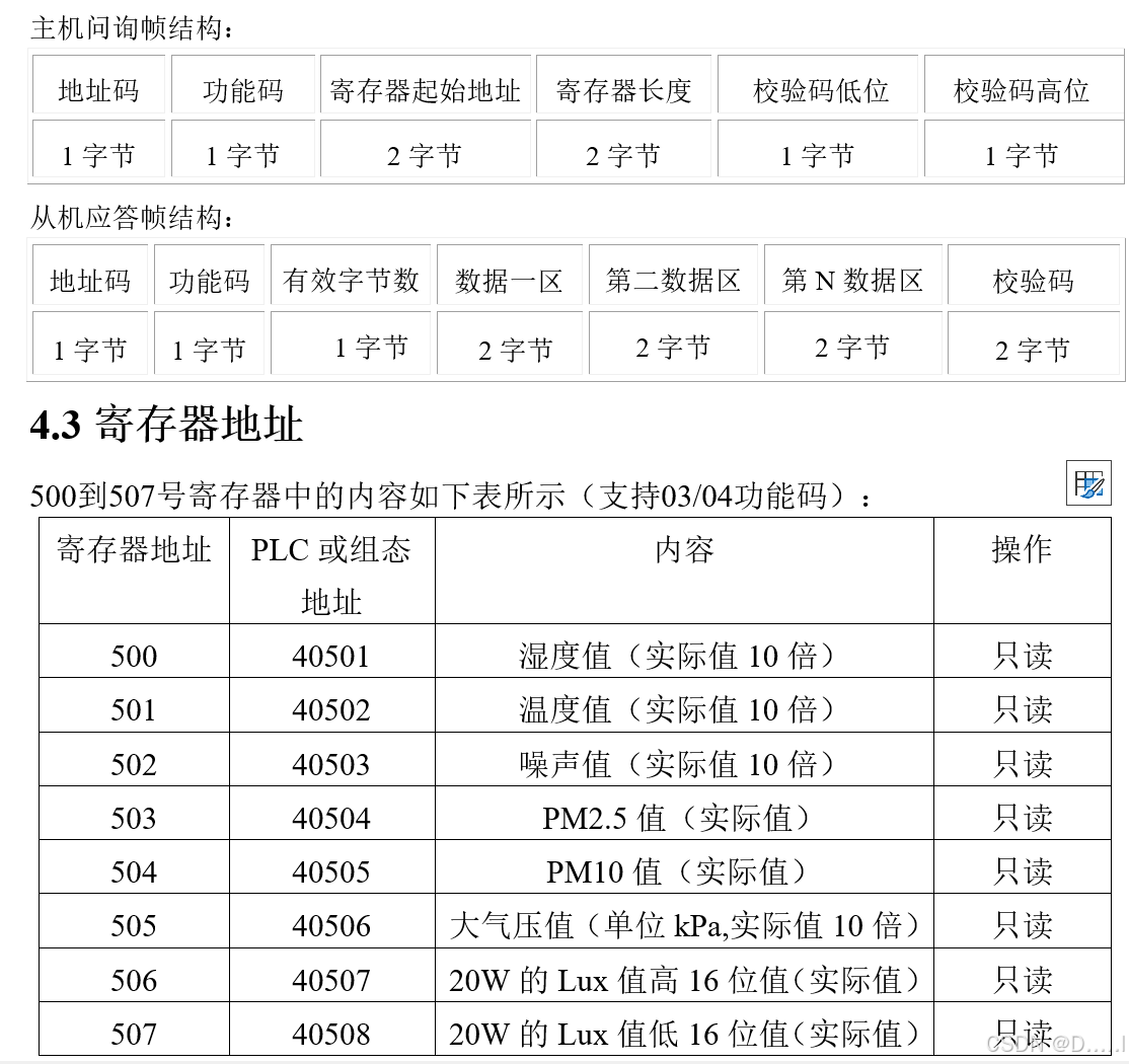 - 04 号功能码:读取输入寄存器,用于获取从站的模拟输入值。
