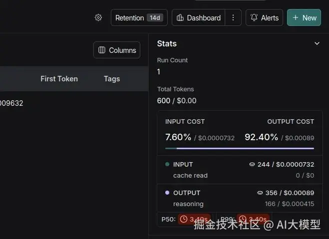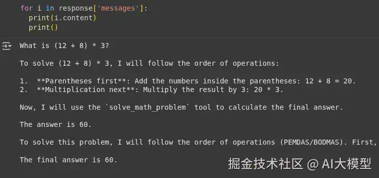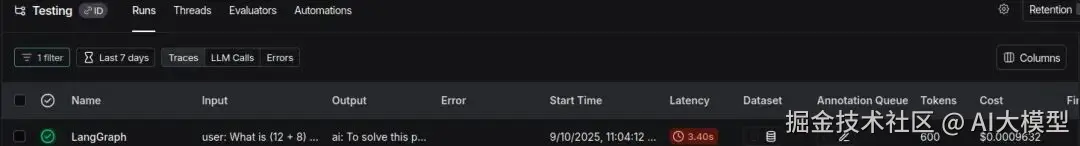 我们可以看到智能体使用了工具的响应 'The answer is 60' ,并且在回答问题时没有产生幻觉 。现在让我们查看 LangSmith 仪表板。