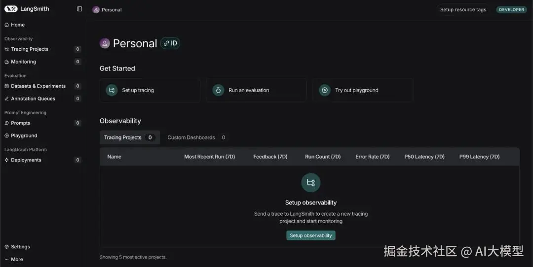 - 访问 LangSmith 仪表板并点击 'Setup Observability' 按钮。然后你会看到这个界面:www.langchain.com/langsmith