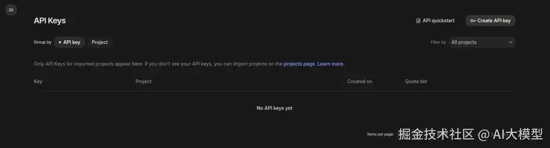 - 点击右上角的 'Create API key',如果项目不存在则创建一个,并将密钥放在手边。