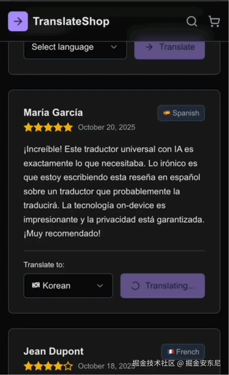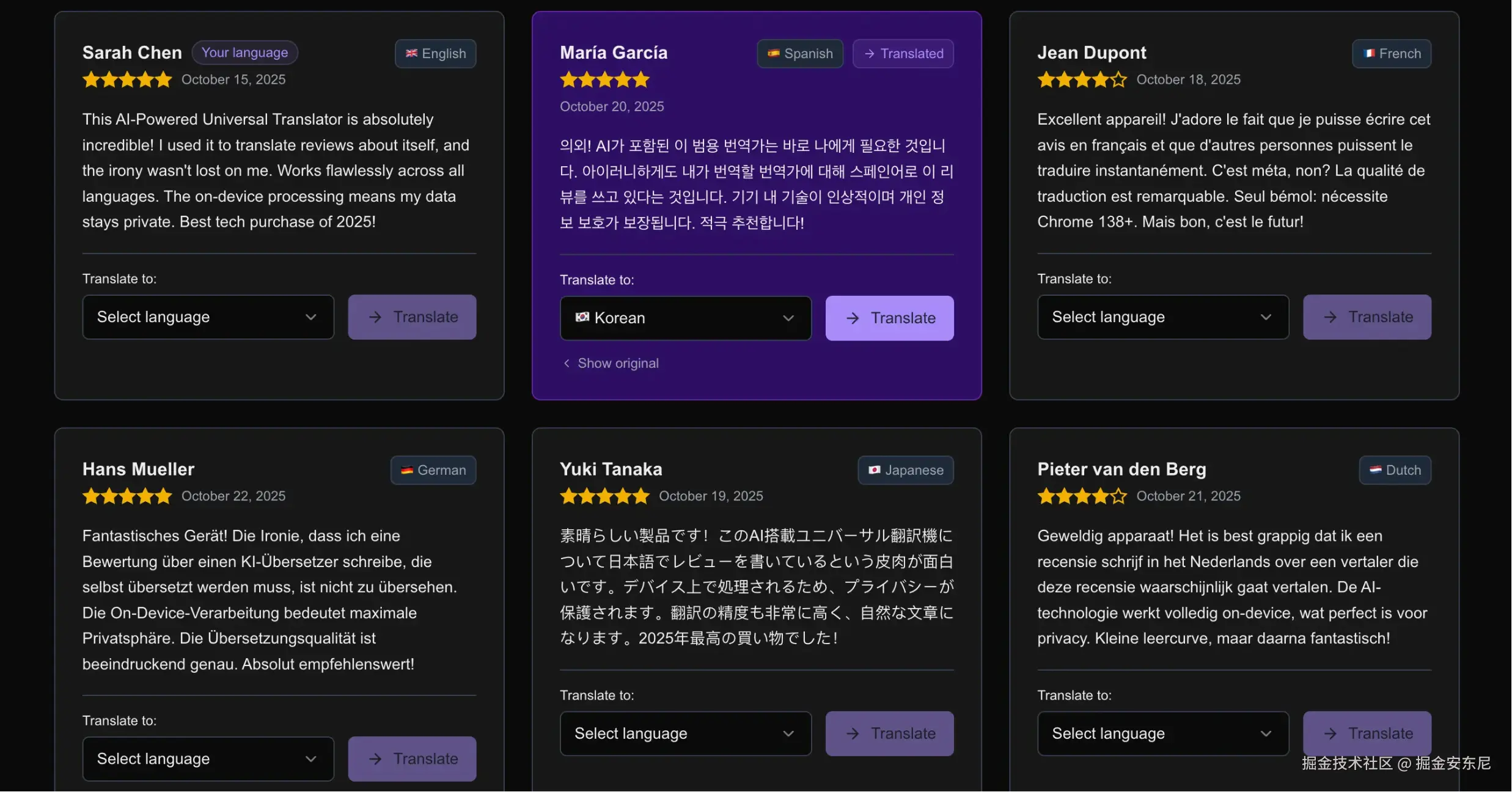 Demo 中有 8 条用户评论,分别是 英语、西班牙语、法语、德语、荷兰语、日语、意大利语、瑞典语。 每条评论都有语言选择器 + 翻译按钮,页面自动识别语言,你可以把任意评论翻译成你偏好的语言。