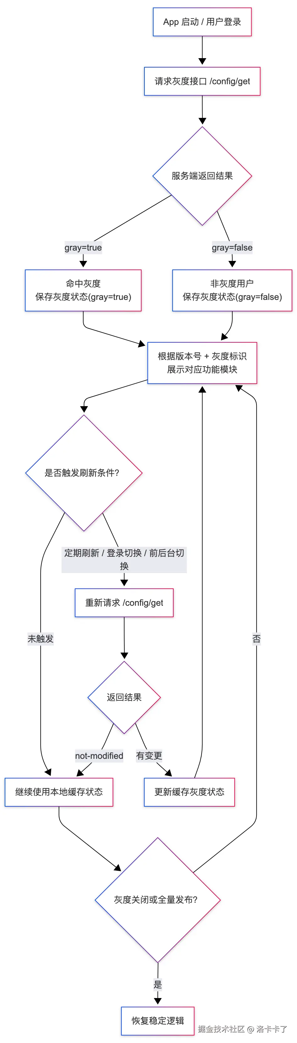 | 小范围 UI 调整、文案替换、按钮显隐 | 逻辑控制式灰度 | 成本低、改动小 |
