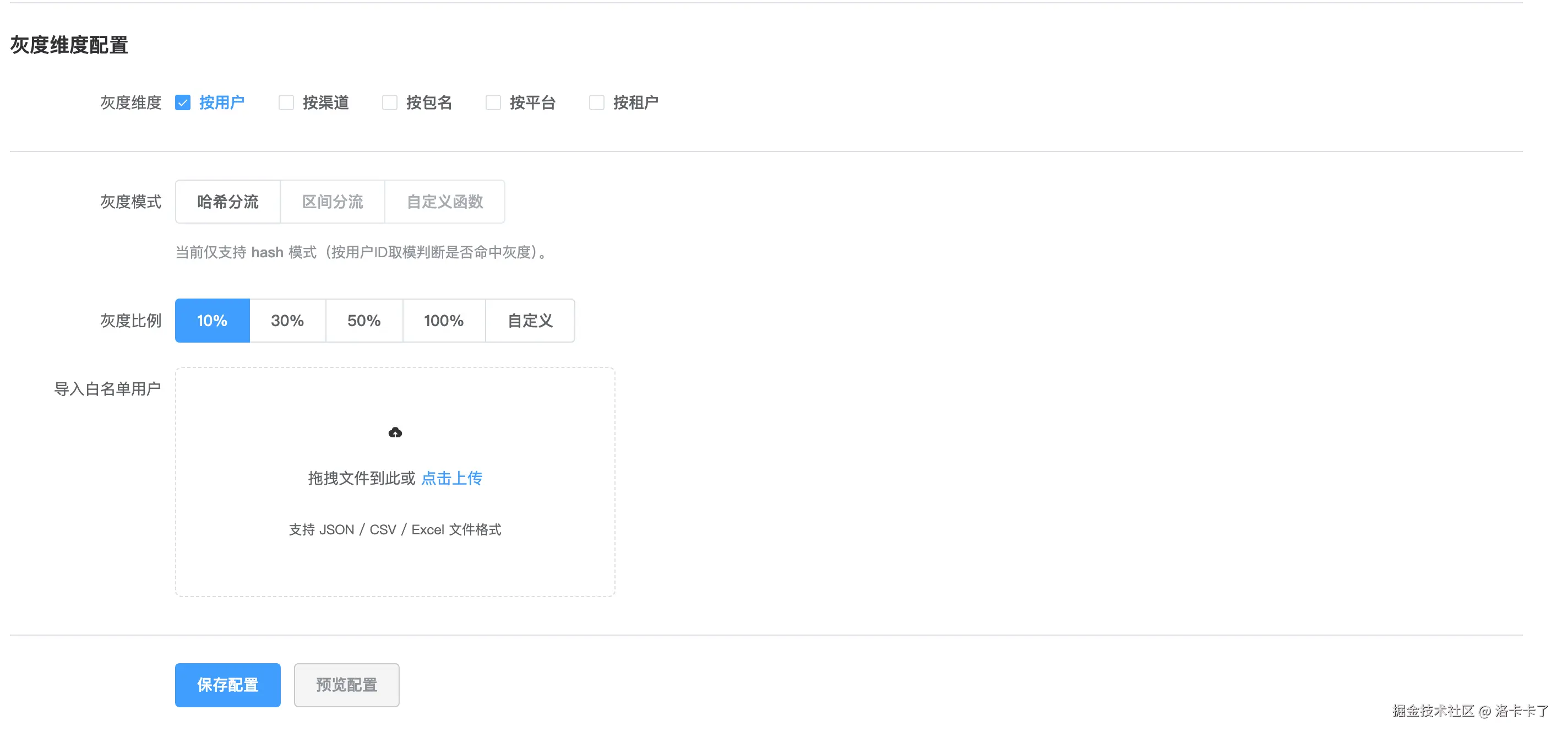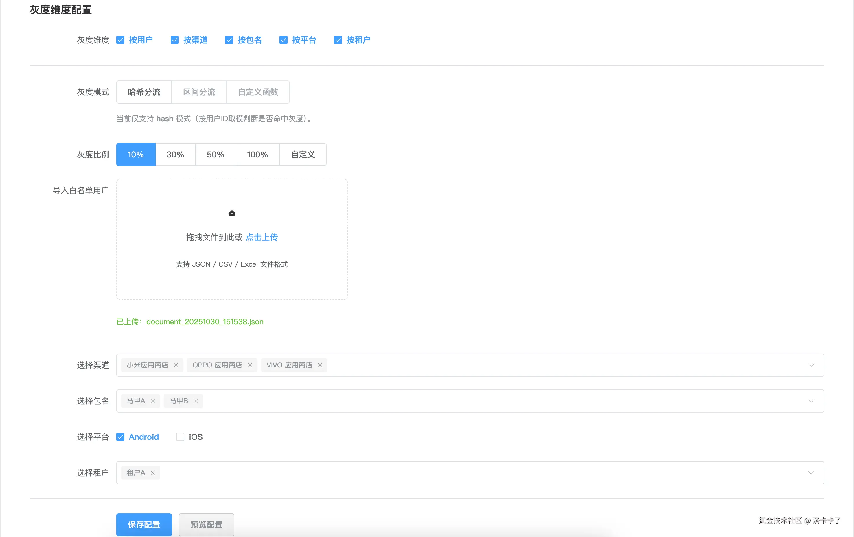 让运营能在后台直接配置灰度策略,比如灰度类型、灰度范围、生效时间、审批流程等。