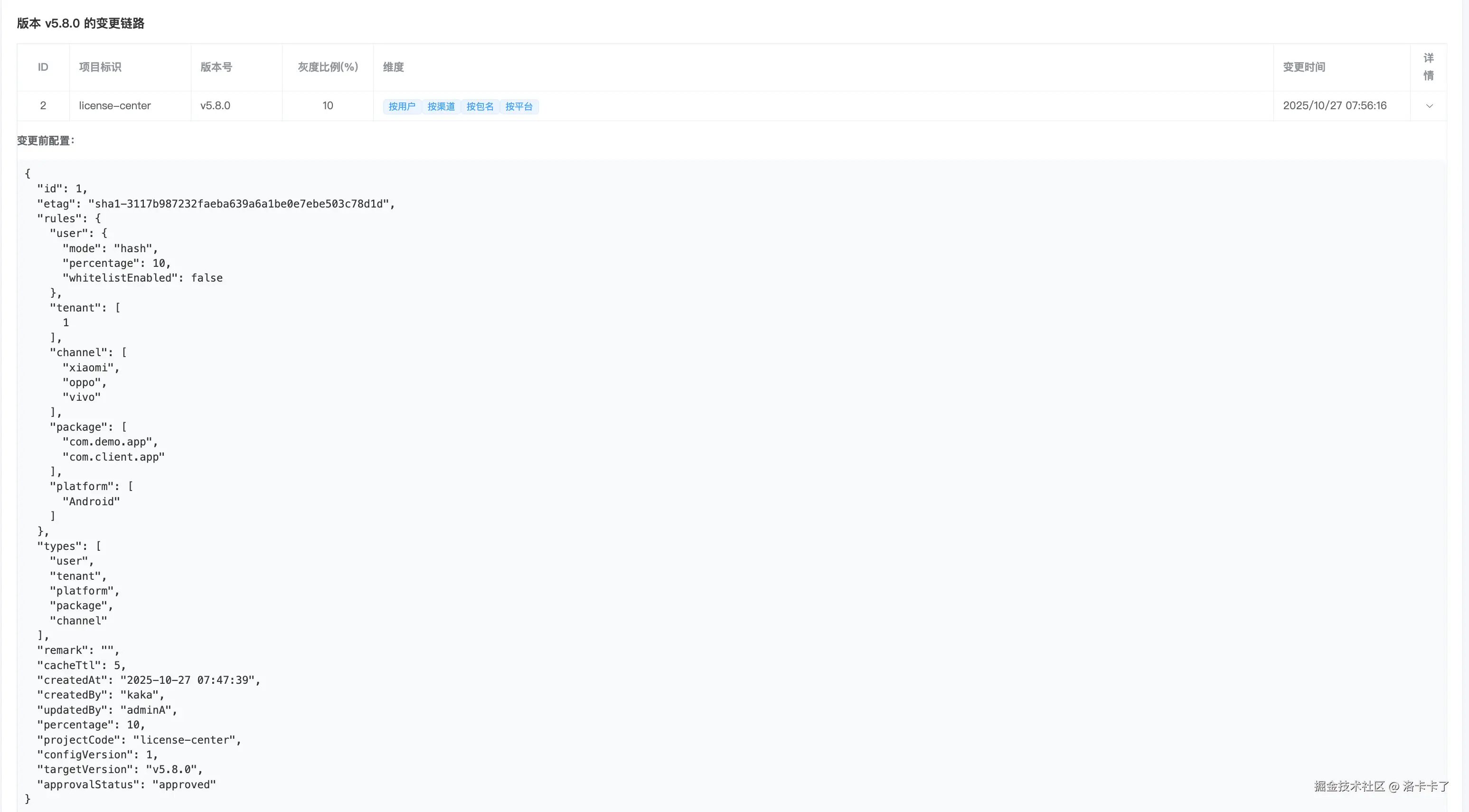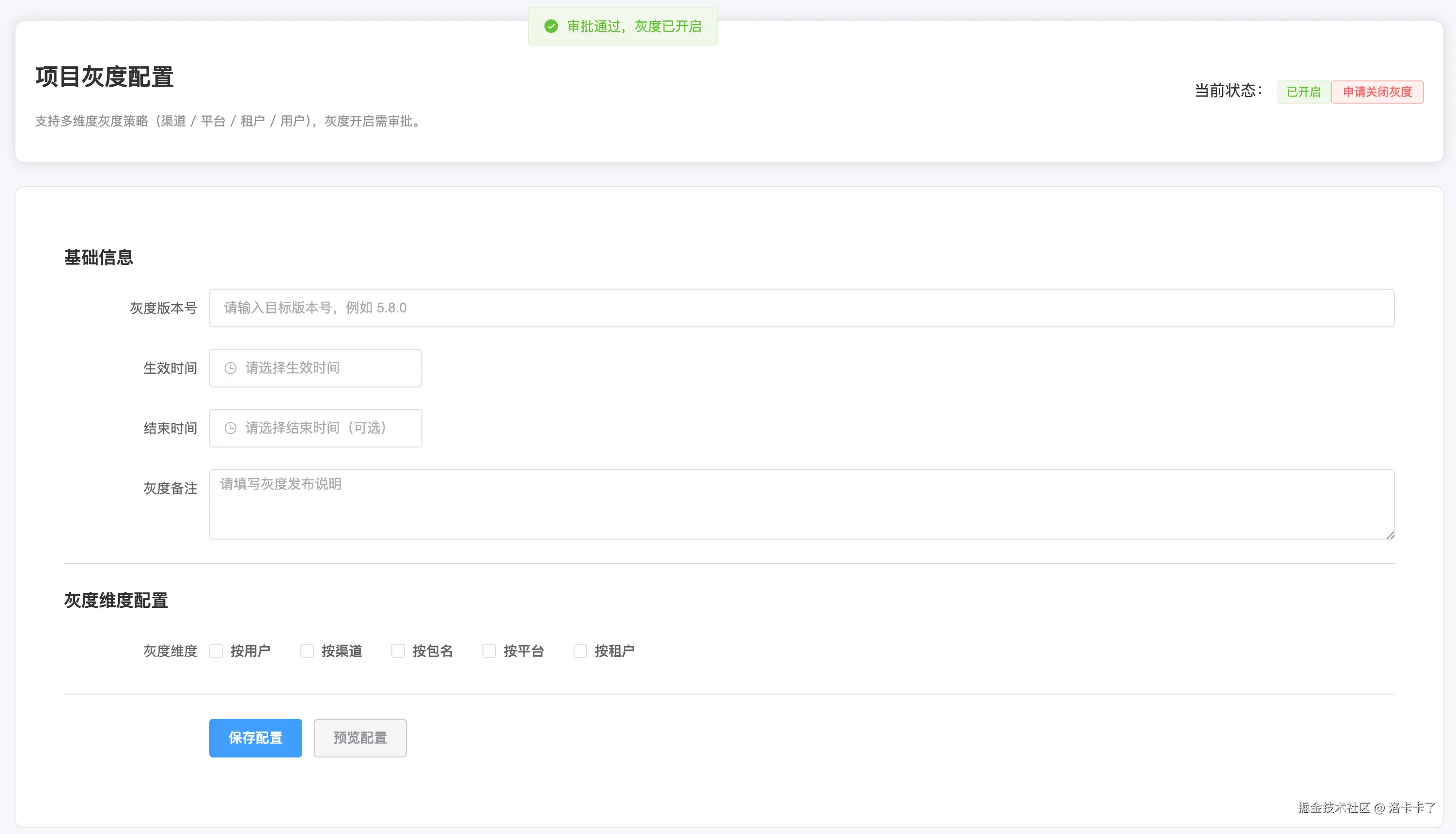 所有灰度的开关、策略配置、审批操作都应该有清晰的界面和操作记录,