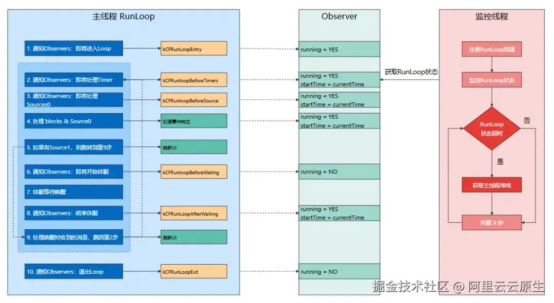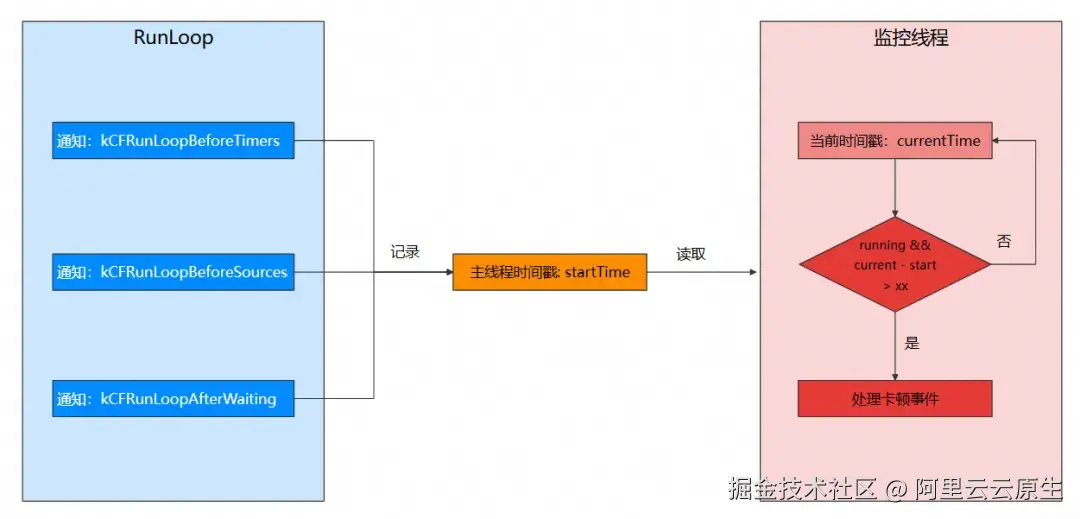 状态标记与超时判断:子线程根据 RunLoop 的状态变化来设置标记,并循环检测该标记是否在预设的阈值内被更新,否则判定为卡顿。