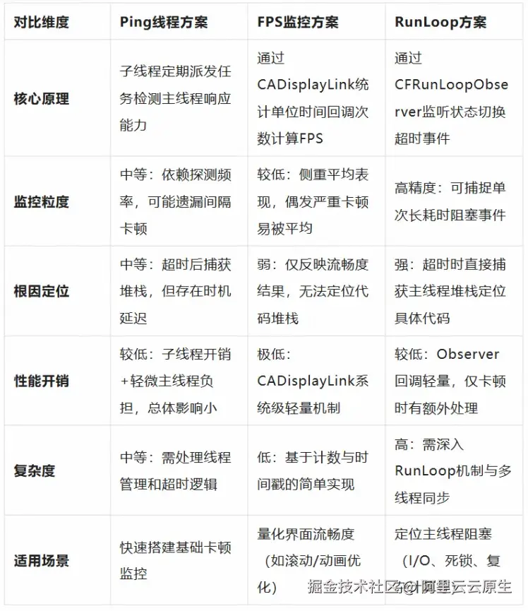 在 iOS 开发中,以下是几种常见的主流卡顿监控方案: