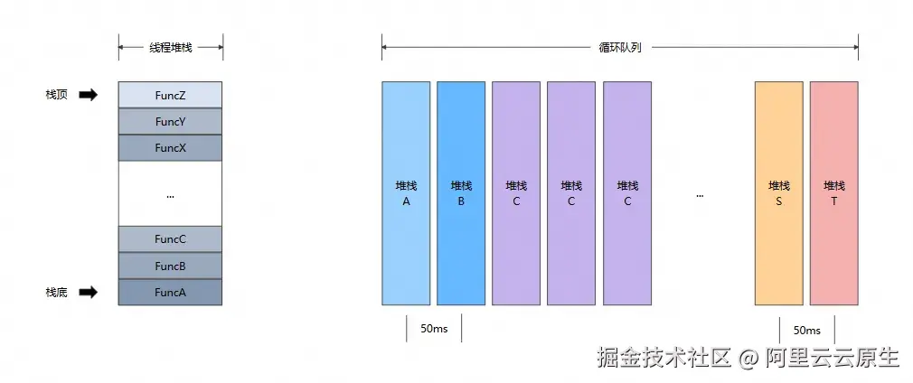 当监控线程监测主线程 RunLoop 时,会获取主线程的线程快照作为卡顿堆栈。但是,这个主线程堆栈不一定是最耗时的堆栈,也不一定是导致主线程超时的主要原因。为了对这个问题进行优化,需要在检测到主线程发生卡顿时,通过对保存在循环队列中的堆栈进行回溯(间隔 50ms 获取一次),获取最近最耗时堆栈。