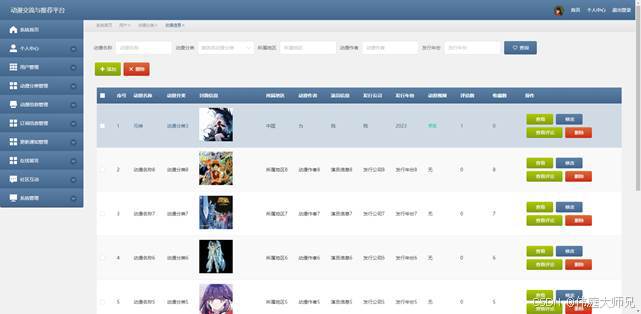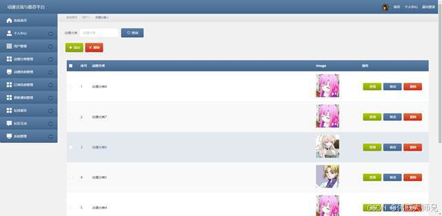 管理员点击动漫信息管理,在动漫信息管理页面输入动漫名称、动漫分类、封面信息、所属地区、动漫作者、演员信息、发行公司、发行年份、动漫视频、评论数、收藏数等信息,可以查询或者添加、删除动漫信息等操作。如图5-11所示: