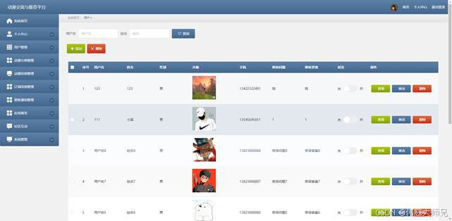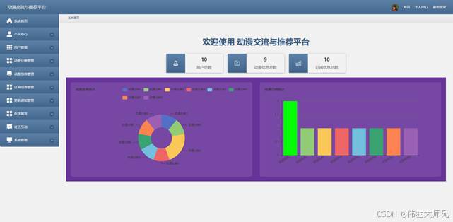 管理员进入主页面,主要功能包括对系统首页、个人中心、用户管理、动漫分类管理、动漫信息管理、订阅信息管理、更新通知管理、在线留言、社区互动、系统管理等进行操作。管理员主页面如图5-8所示: