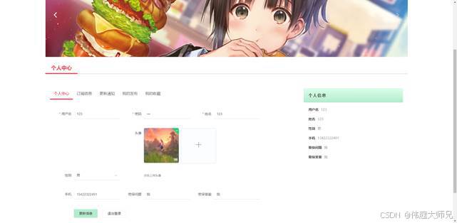 用户点击个人中心,在个人中心页面可以修改个人信息、密码修改,还可以对订阅信息、更新信息、我的发布、我的收藏进行详细操作,如图5-6所示。