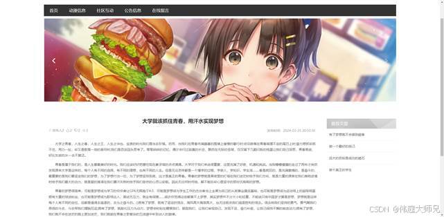 当游客打开系统的网址后,首先看到的就是首页界面。在这里,游客能够看到动漫交流与推荐平台的导航条显示首页、动漫信息、社区互动、公告信息、在线留言、个人中心。