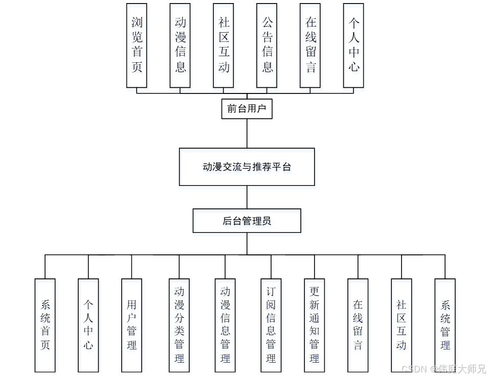 为了更好地发挥本系统的技术优势,根据动漫交流与推荐平台的需求,本文尝试以B/S经典设计模式中的Spring Boot框架,JAVA语言为基础,通过必要的编码处理、动漫交流与推荐平台整体框架、功能服务多样化和有效性的高级经验和技术实现方法,旨在完成一个快速、高效、便捷的动漫交流与推荐平台。本系统以用户与管理员两类人,作为目标用户,其中用户主要功能包含用户的注册与登录,查看动漫信息进行订阅等,对账号相关信息的修改;管理员主要功能包括了对用户信息、动漫信息、订阅信息、更新通知、在线留言、社区互动等管理;管理员可以实现最高权限级别的全系统管理。