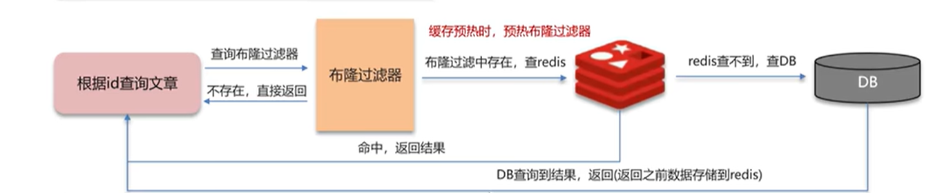 流程:请求首先经过布隆过滤器,如果过滤器中存在,查询redis,如果不存在直接拦截,缓存预热时需要预热布隆过滤器,热点数据可以先批量添加到缓存中,请求也会优先读取缓存,添加数据到缓存的同时也要添加到布隆过滤器中
