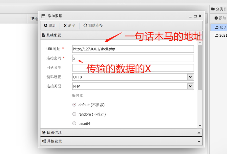 地址是上传的一句话木马的位置,密码即为参数名称,测试连接成功