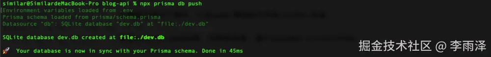 现在我们 .evn 和 schema.prisma 都配置好了,接下里就可以生成我们的数据库了:进入到项目根目录,运行下面指令