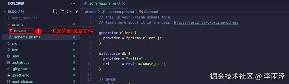 此时在项目中的 prisma 文件夹中,你会发现多出了一个 dev.db 文件,到此我们的数据库就生成成功了。