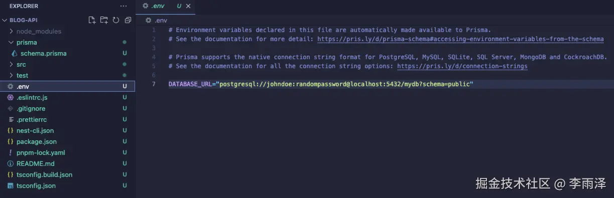 .env 文件里面就一个 PostgreSQL 数据库的连接配置,我们先将其改为 SQLite 的连接配置,改完之后如下所示