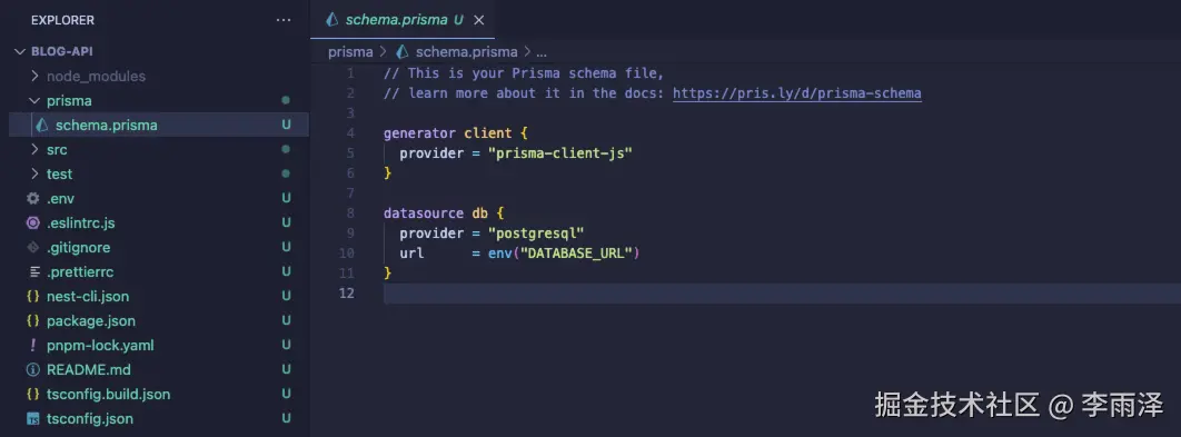 数据库连接字符串配置好后,接下来我们需要定义数据库的表结构,表结构是在 schema.prisma 文件中定义的。而 schema.prisma 文件是上一篇文章中进行 prisma 初始化的时候自动生成的,初始内容如下图: