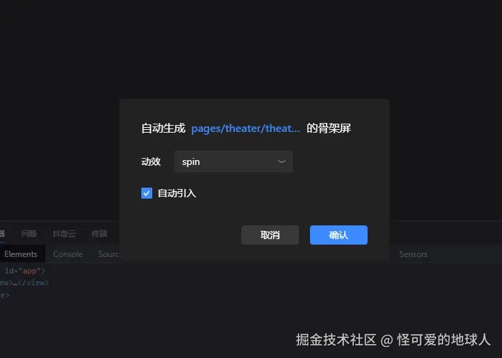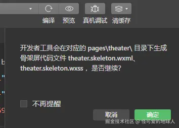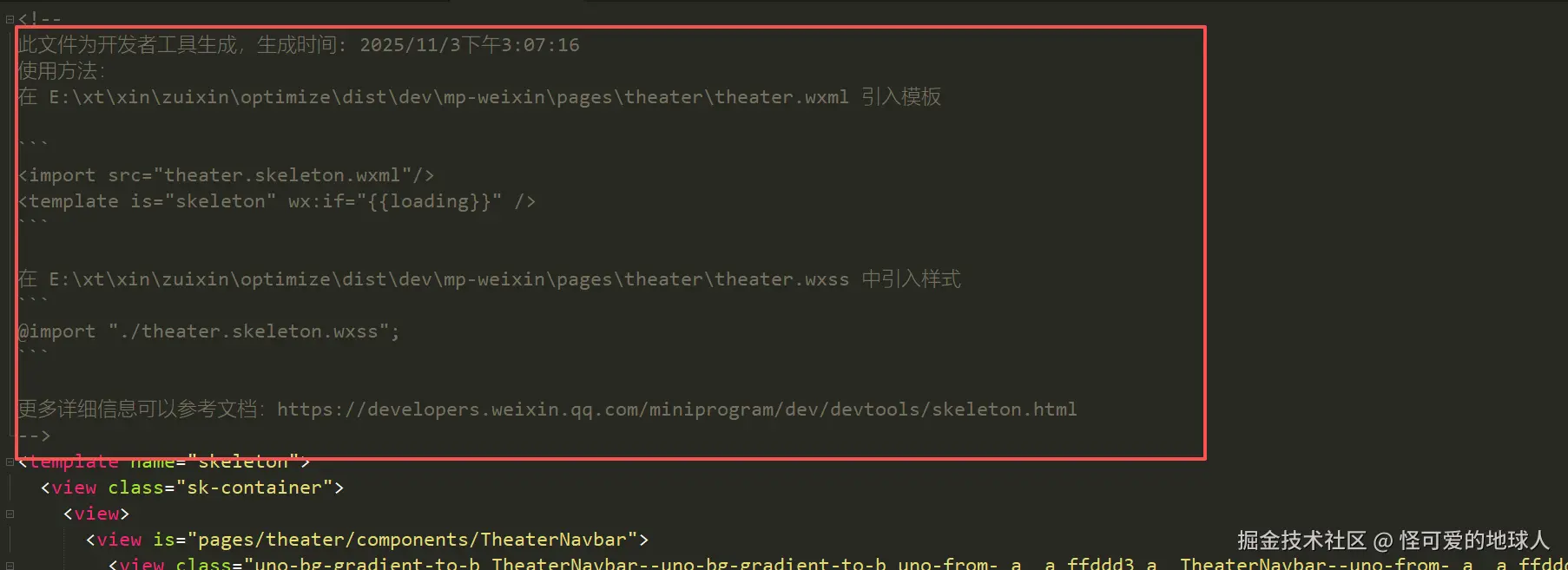 pages/theater/theater)生成骨架,拿到theater.skeleton.wxml/wxss。 - 2.将这两个文件改造成"原生自定义组件"(避免每次构建被覆盖):