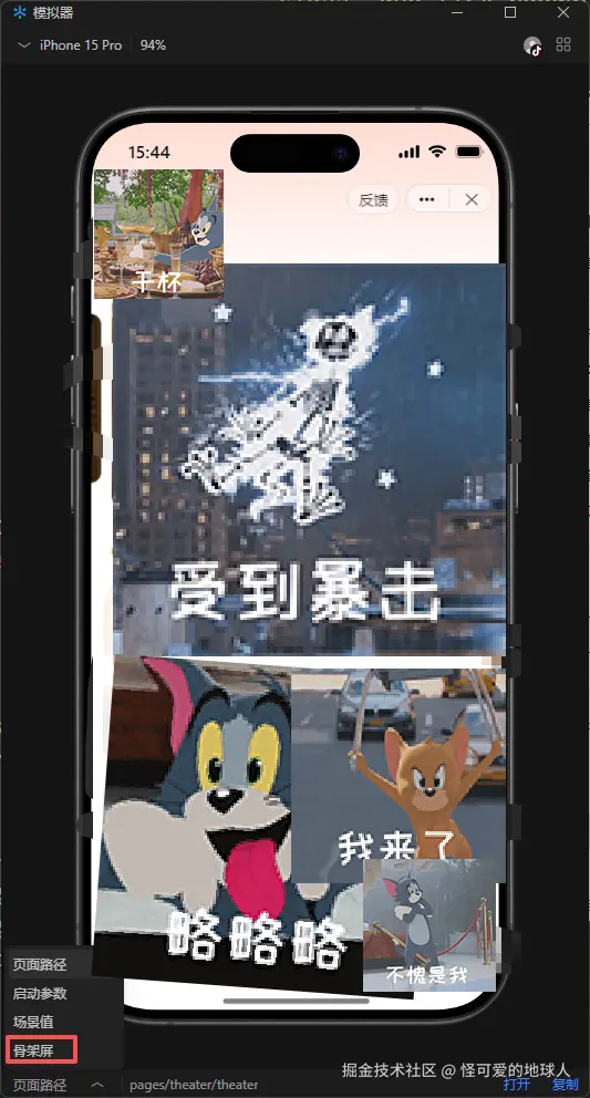 pages/theater/theater、pages-toutiao/playlet/index:用自动生成(各自端启用框架骨架),并把超时隐藏设为 0,数据到齐后主动移除,避免闪烁。