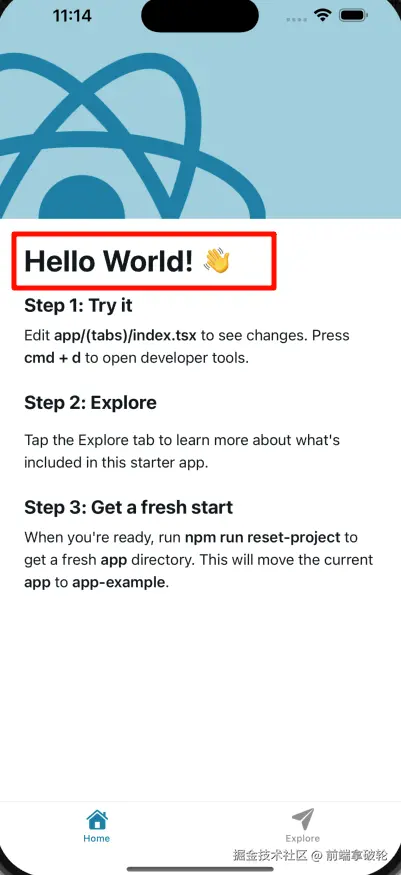打开app/(tabs)/index.tsx文件,可以看到首页的代码。我们尝试修改Welcome!为Hello World!。
