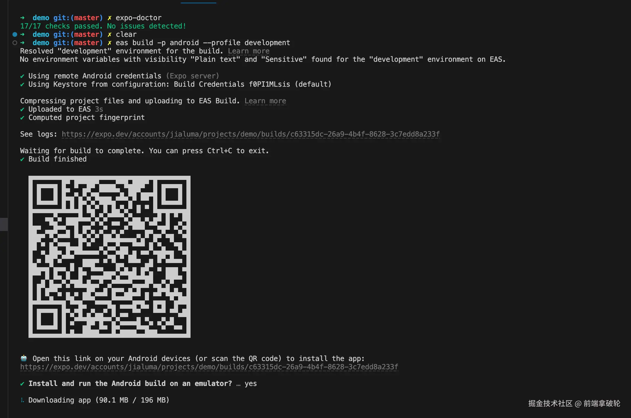 云构建完成后,终端会输出一个二维码,用Android手机扫码即可下载应用。