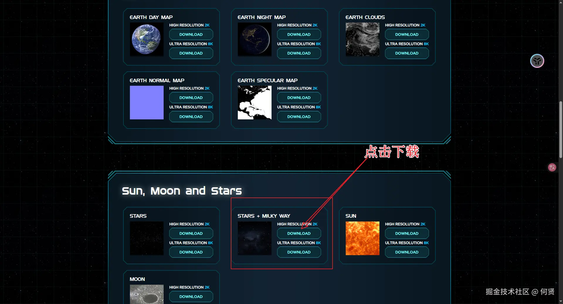 在此也顺便推荐一个优秀的 3D 贴图资源站 ------ Solar System Scope。 本项目中使用的所有行星与星云贴图,均来自该网站。 这里找到星云图
