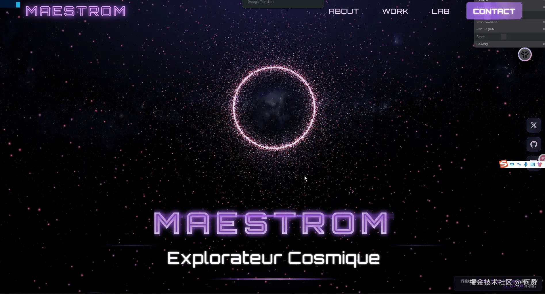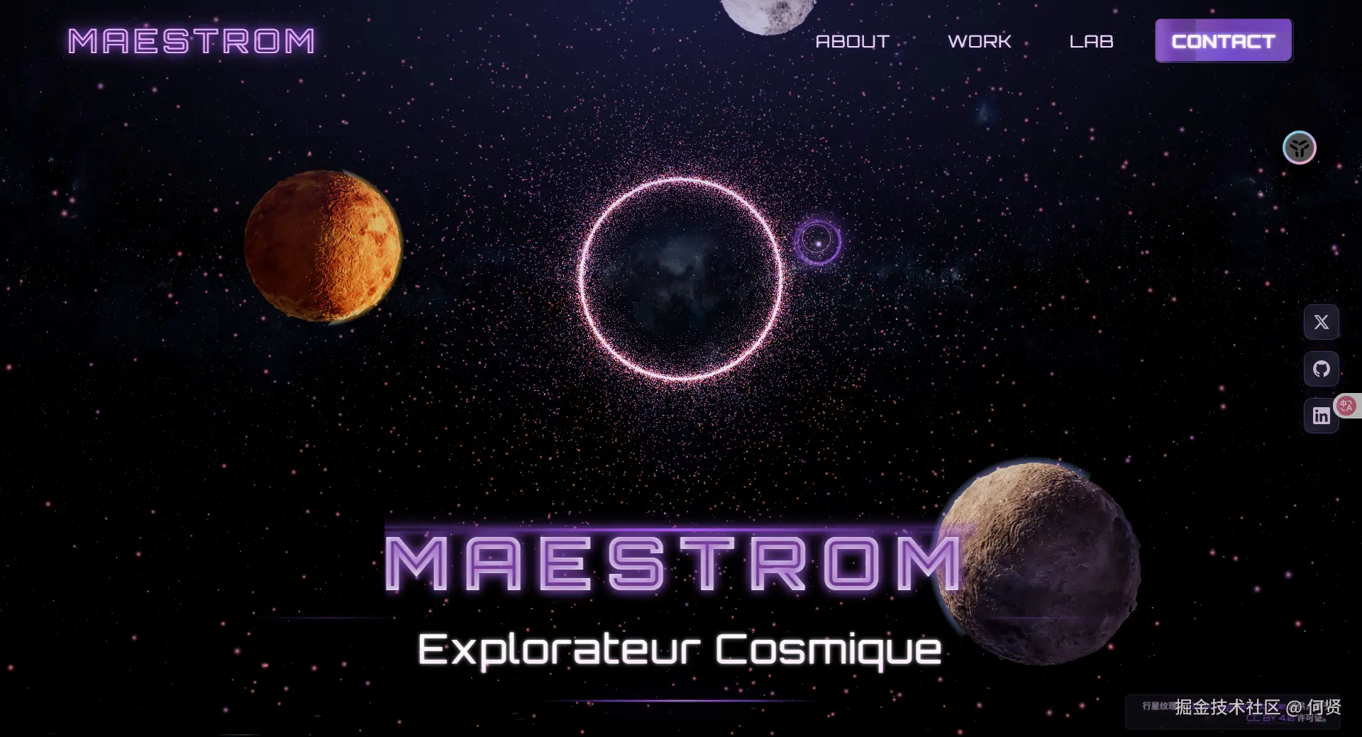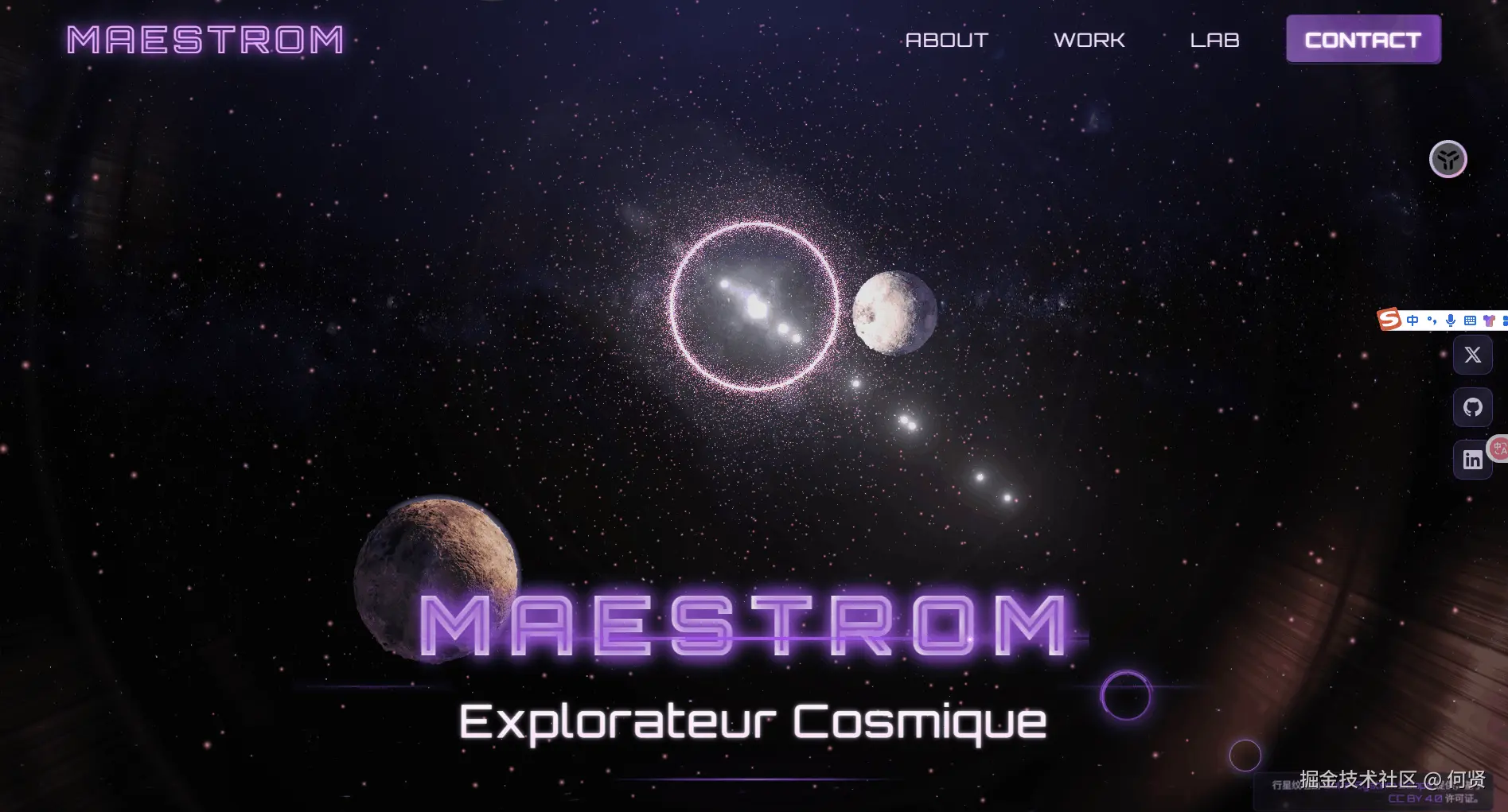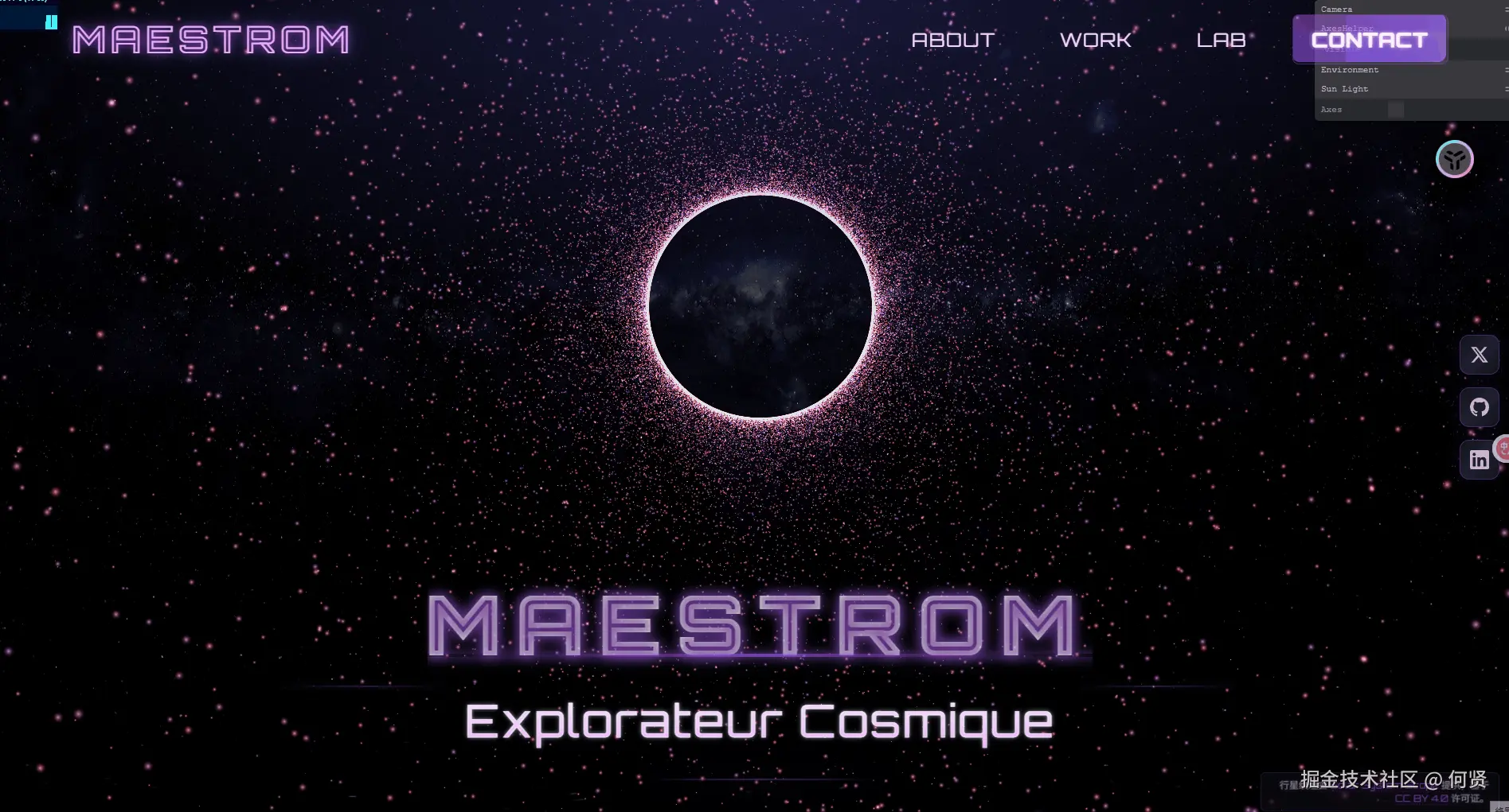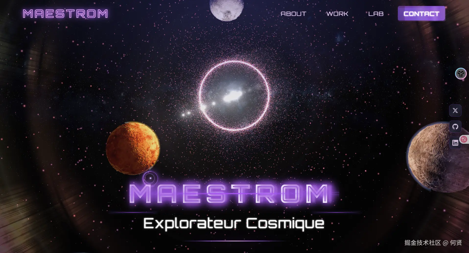 这一部分构成了整个 Hero Section 的核心视觉焦点。我们通过 Points 系统创建了一个由大量粒子组成的螺旋星系,其中包含星星和中心星环。