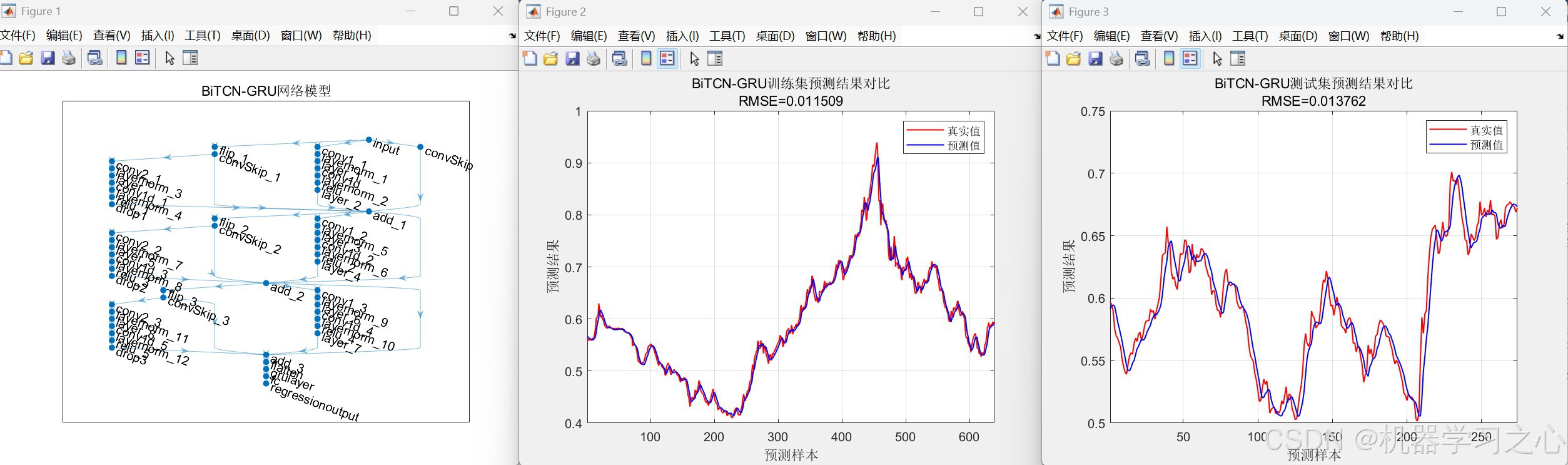 filterSize = 3:卷积核大小numFilters = 30:TCN滤波器数量numBlocks = 3:TCN残差块数量(深层结构)NumNeurons = 35:GRU隐藏单元数(比之前增加)dropoutFactor = 0.1:空间丢弃率