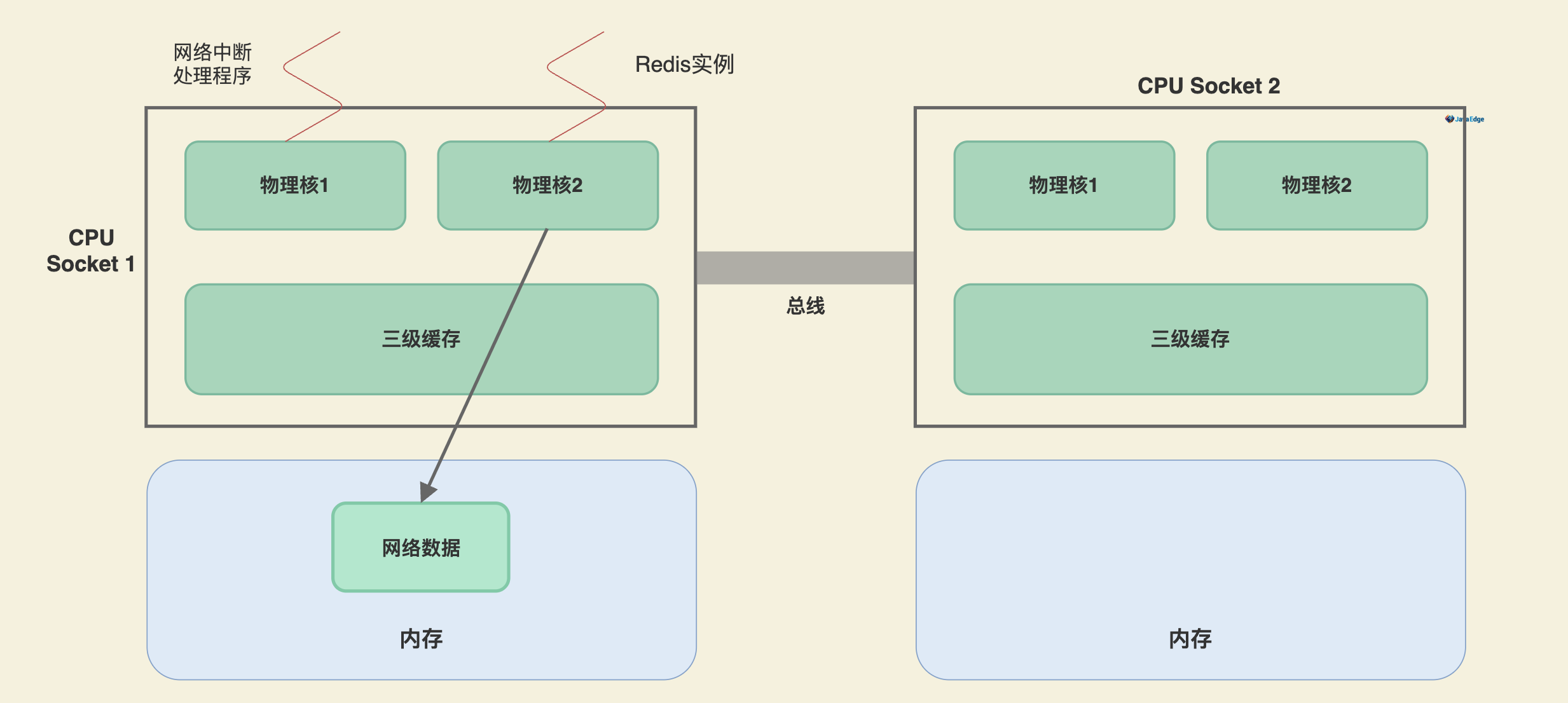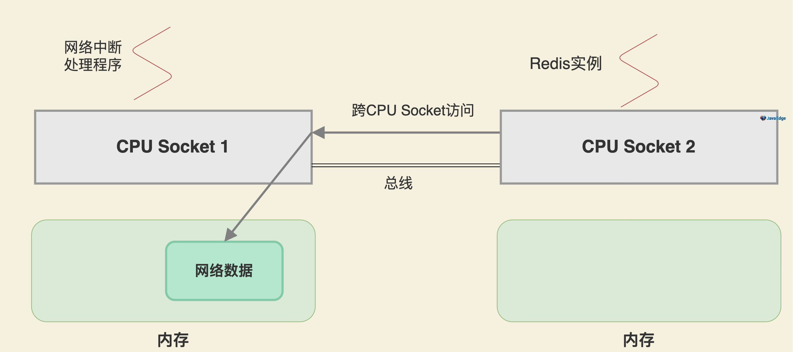 此时,网络中断处理程序读取到的网络数据,被保存在CPU Socket 1的本地内存,当Redis实例要访问网络数据时,就需Socket 2通过总线把内存访问命令发送到 Socket 1,进行远程访问,时间开销较大。