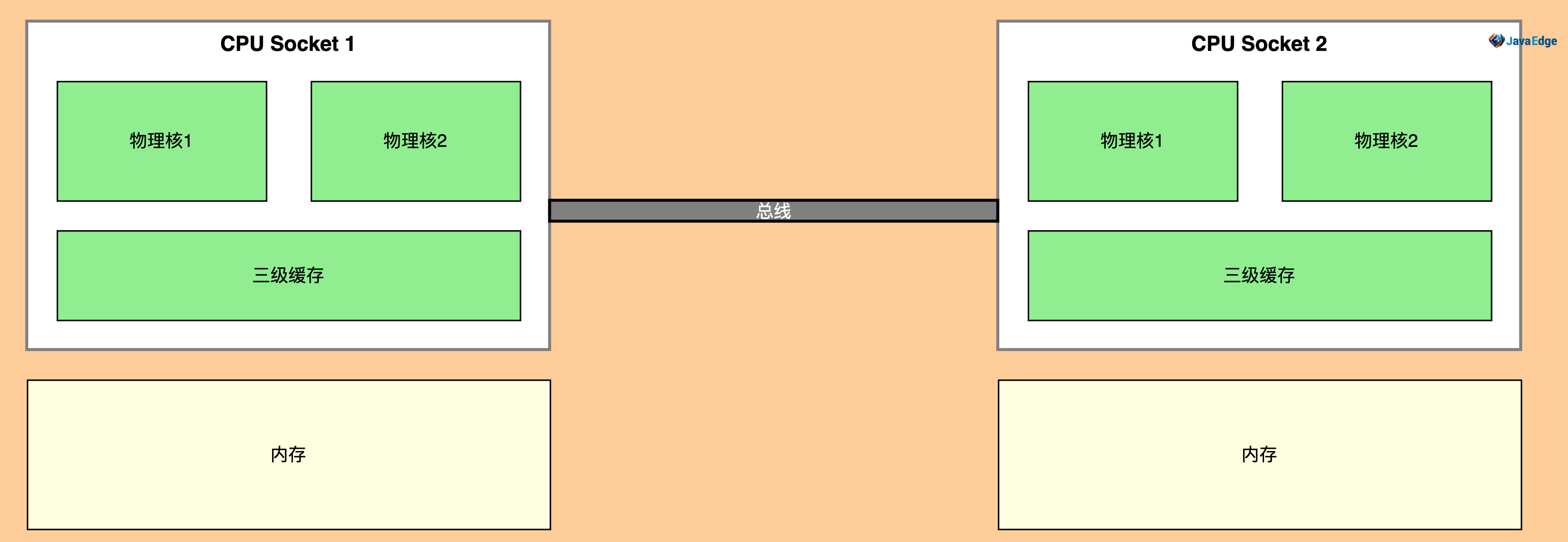为提升服务器处理能力,服务器通常还有多个CPU处理器(多CPU Socket),每个处理器有自己的物理核(包括L1、L2缓存),L3缓存及连接的内存。