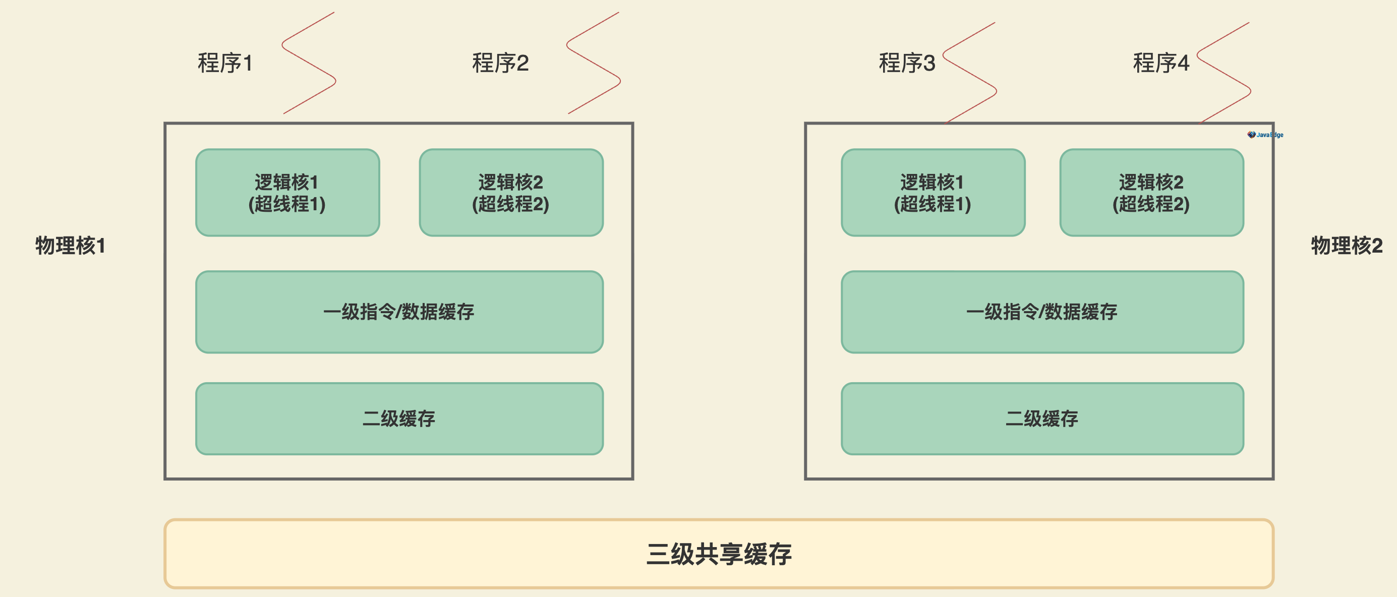 - 程序1和程序2运行在物理核1的两个超线程上,程序3和程序4运行在物理核2上