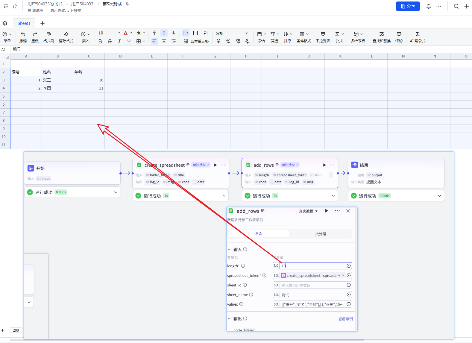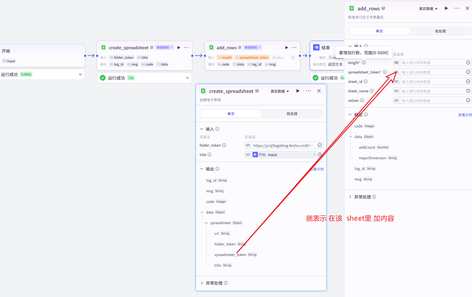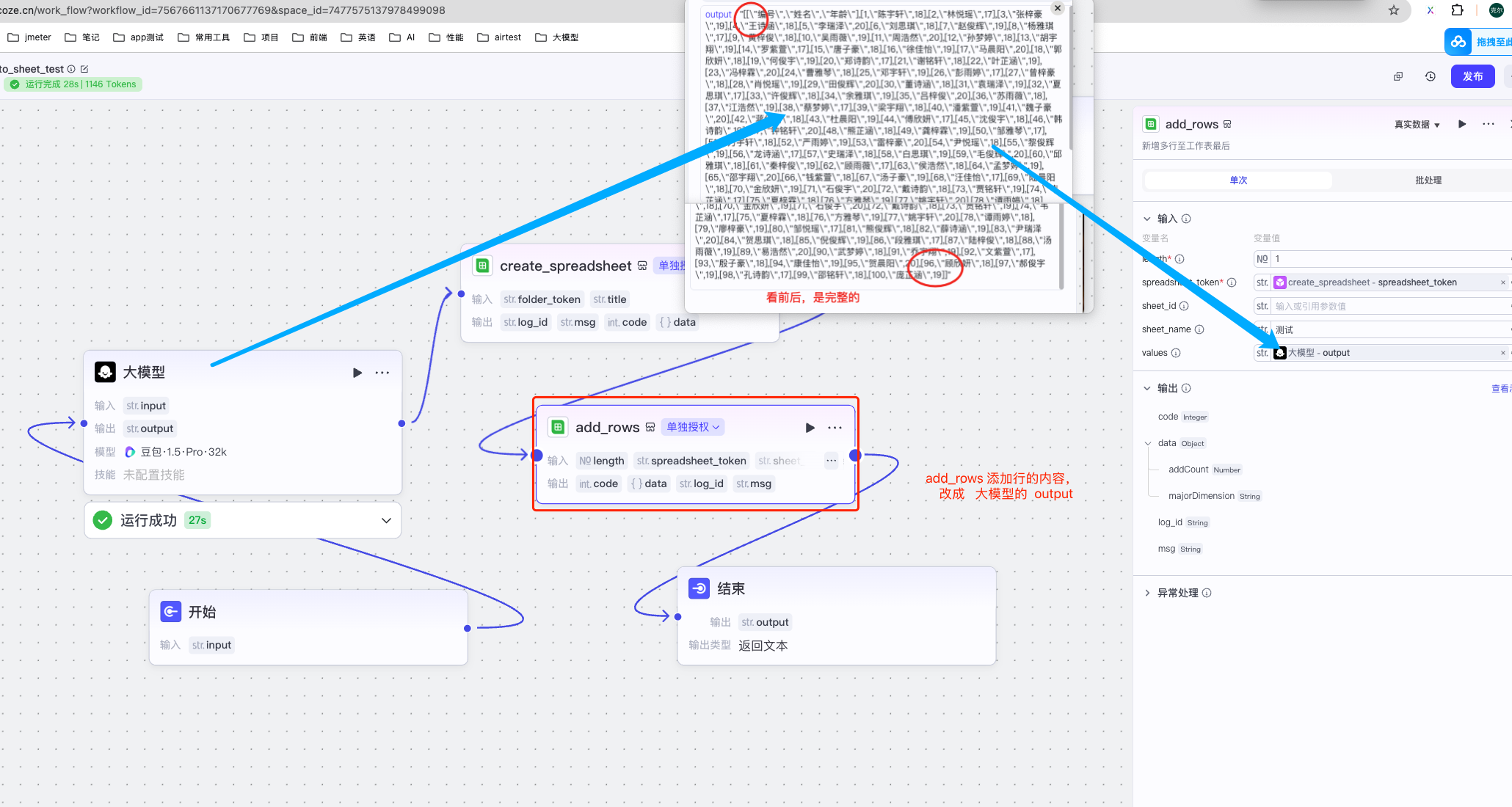 点大模型的节点,单独测试,看看效果。然后改下add_rows, 然后试运行