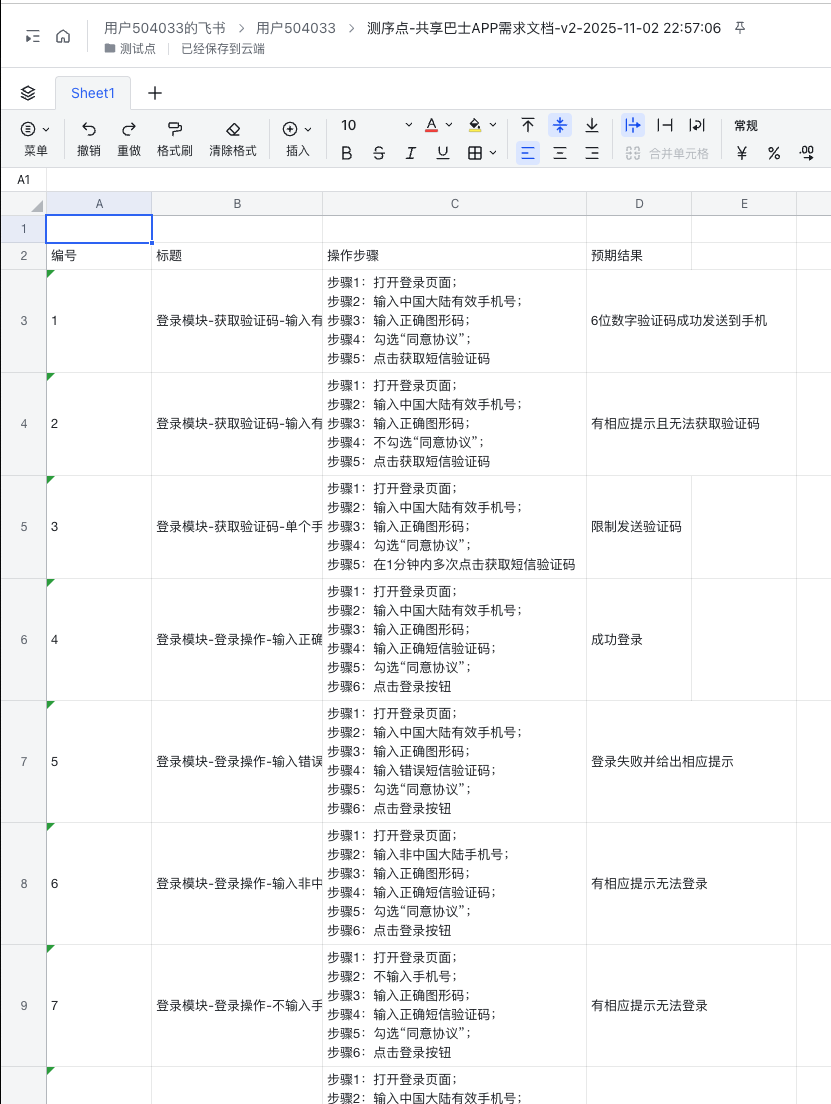 - 依次把每个测试点,转换为详细测试用例,内容包含编号、标题、操作步骤、预期结果。如果1条用例无法覆盖测试点,可以写多条用例。