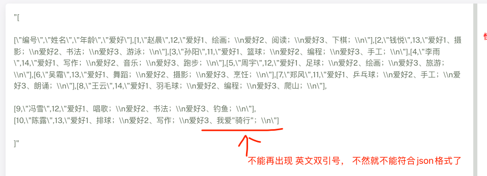 对于测试用例中,用例标题或者步骤中,会存在双引号,类似于上面的,比如爱好字段中,不能存在 英文双引号。