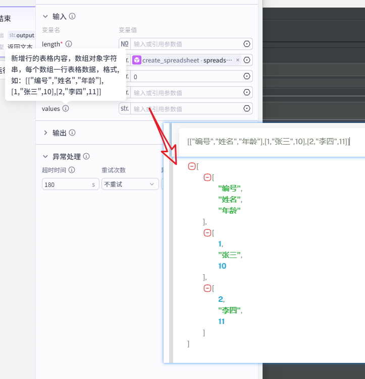 [["编号","姓名","年龄"],[1,"张三",10],[2,"李四",11]]