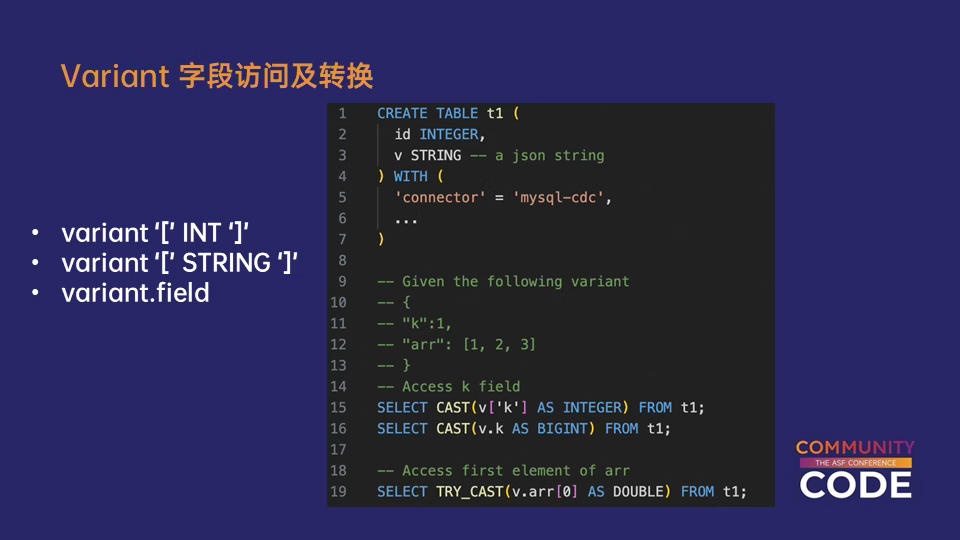 Flink 2.2版本将进一步完善Variant数据类型的功能,重点提供更加灵活和强大的字段访问能力。用户将能够使用直观的语法访问Variant类型中的嵌套字段,同时支持灵活的类型转换操作,使得Variant类型能够与现有的强类型处理流程无缝集成。
