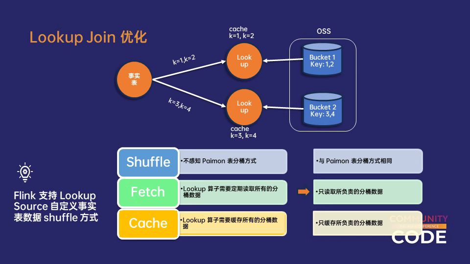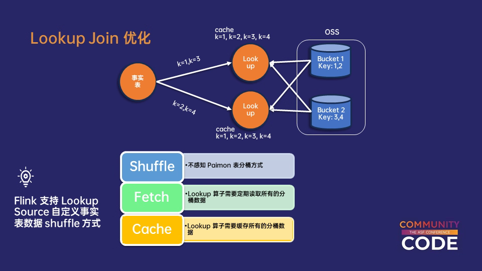 该解决方案涉及扩展Flink的Lookup Join架构以支持自定义 shuffle 策略。这确保了预期到特定Paimon分桶的记录由负责该分桶维度数据的相同 Lookup 算子处理。