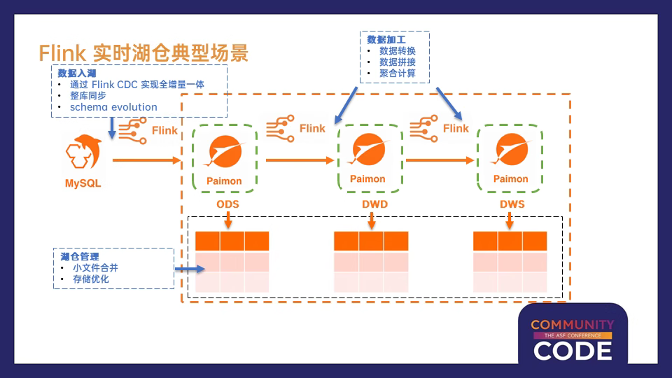 Flink CDC在弥合操作数据库和分析系统之间的差距方面已被证明特别有价值。与需要在固定时间表上运行的复杂ETL管道不同,Flink CDC使组织能够实时捕获来自MySQL等源系统的变更,并直接将其流式传输到Paimon的ODS(操作数据存储)层。这种方法不仅减少了延迟,还通过消除对中间暂存区和复杂协调机制的需要来简化整体架构。