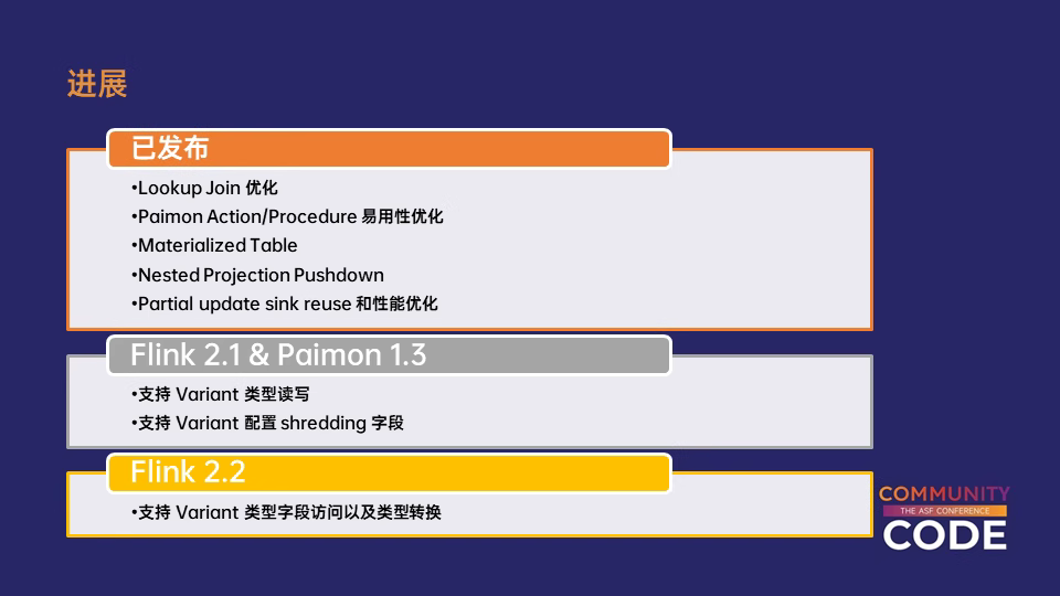 在Flink 2.1和Paimon 1.3的版本发布中,重点关注Variant数据类型的基础支持能力。这个版本将提供完整的Variant类型读写功能,使得用户能够在Flink和Paimon中原生处理半结构化数据,而不需要依赖复杂的字符串解析操作。