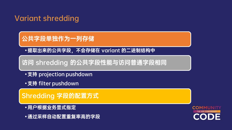 同时,这个版本还将支持Variant配置的shredding字段功能,允许用户根据数据访问模式手动配置哪些字段需要进行shredding优化。这为有明确数据访问模式的企业用户提供了精细控制的能力,能够针对具体的业务场景进行深度的性能调优。