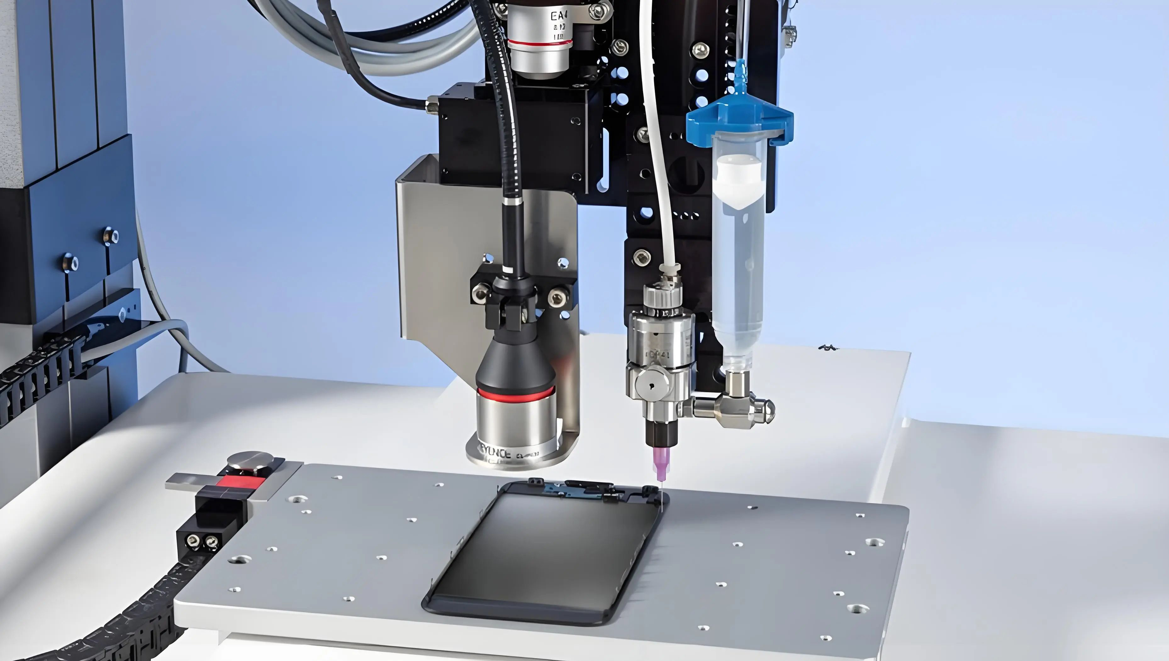 传统点胶设备通常采用人工输入点胶路径来驱动点胶阀的运动,这种方式生产效率低下且无法适应产品尺寸误差,点胶精度受到很大限制。对于手机摄像头模组这类微型元件,点胶位置的微小偏差就可能导致摄像头对焦失灵、图像抖动甚至彻底故障。