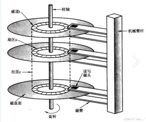- 柱面:同半径的磁道叠成"圆柱"(定位"数据在哪个半径的磁道");