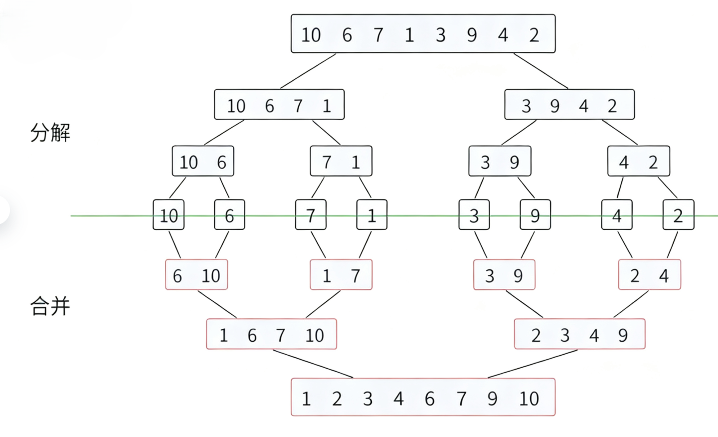 先将序列分解成子序列,将已有序的⼦序列合并,得到完全有序的序列;即先使每个⼦序列有序,再使⼦序列段间有序