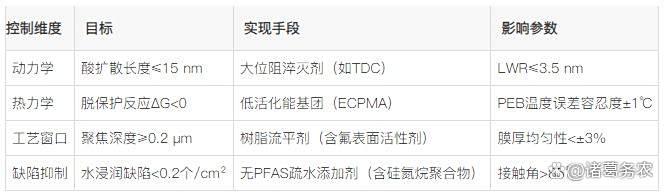 控制核心:动力学上通过淬灭剂压缩酸扩散,热力学上优化脱保护能垒与Tg,实现纳米级图形精度。