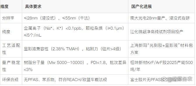 2025年KrF/ArF国产化率目标10%,南大光电、彤程新材等企业产能加速扩张(南大500吨/年)。