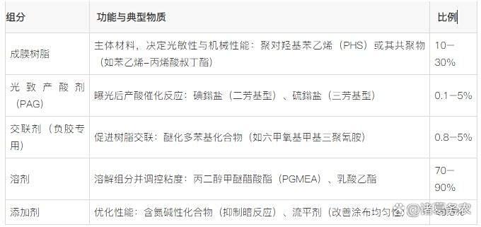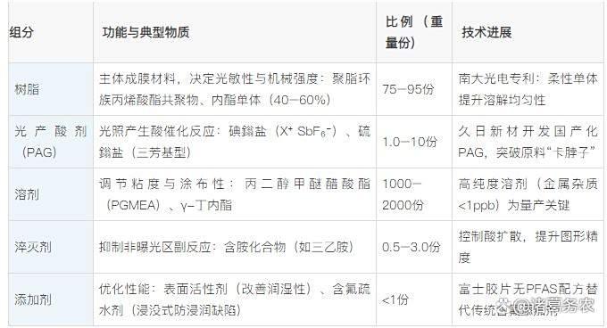 代表配方:树脂以聚脂环族丙烯酸酯为主,光产酸剂(PAG)采用碘鎓盐或硫鎓盐。