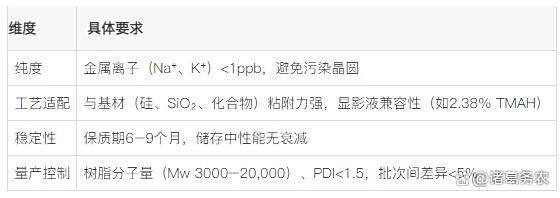 要求:金属杂质<0.1ppb,批次一致性(分子量分布PDI<1.5),与涂胶显影设备兼容(如芯源微国产设备)。
