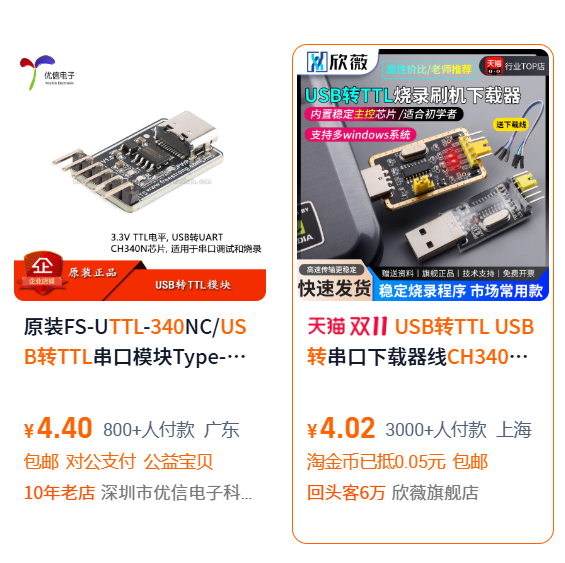 连接 USB 转串口模块(如 CH340):
